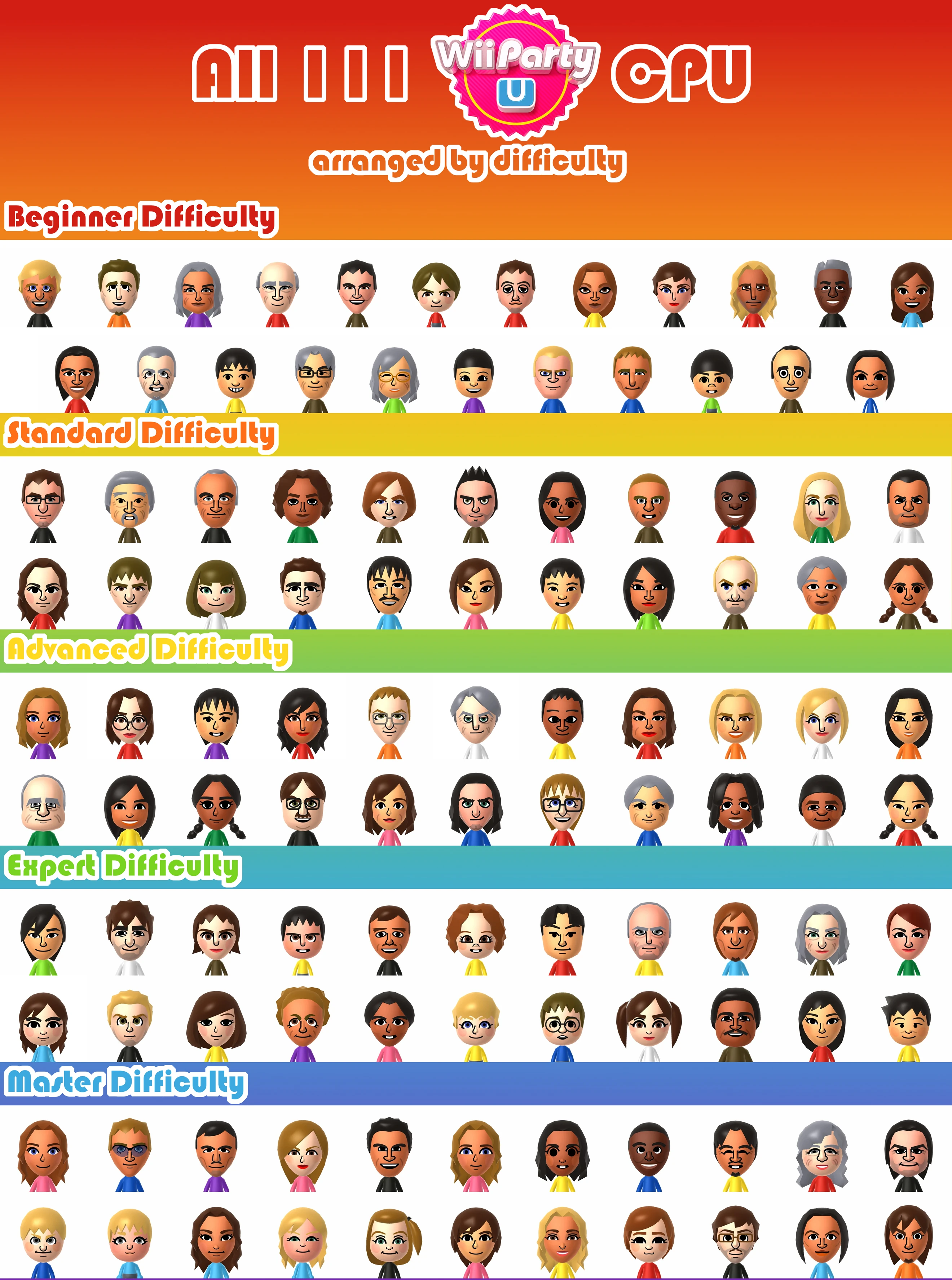 - The Miis' internal ID sorting organizes the Difficulty Ranking in Wii Party. Starting from Saburo (000) up to Marisa (099), the pattern follows Beginner Difficulty, Standard Difficulty, Advanced Difficulty, Expert Difficulty, Master Difficulty, and after reaching Master Difficulty, it loops back to Beginner Difficulty. It repeats 20 times until all 100 Miis are ordered in that way. The Internal IDs also follow nationality (Saburo, Hiroshi, and all the other Japanese Miis have consecutive Internal IDs). They then ditched the Beginner Difficulty-Standard Difficulty-Advanced Difficulty-Expert Difficulty-Master Difficulty pattern when making Wii Party U. If they didn't, Miis like Alphonse, Mitsu, Olga, Joseph, and Bruce would've been in different difficulties.